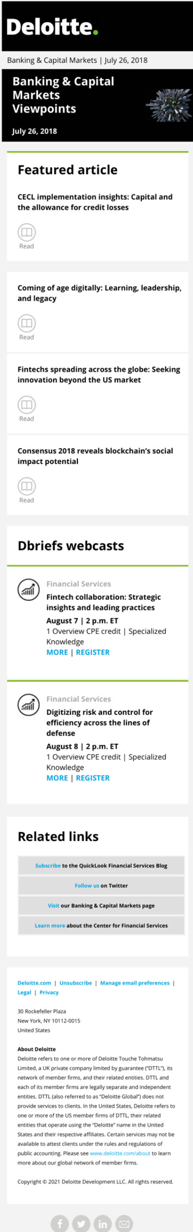 The Articles have been divided into two column layout with left side title and teaser, other side the image of the landing page but with smaller size of the images. Hide and Show approach is used wherein article-image is replaced with read-icon in mobile version and also content of each article is hidden for mobile version. The Dbriefs webcasts section has been changed as per the layout used in the actual Dbriefs invite to make it look similar and familiar.