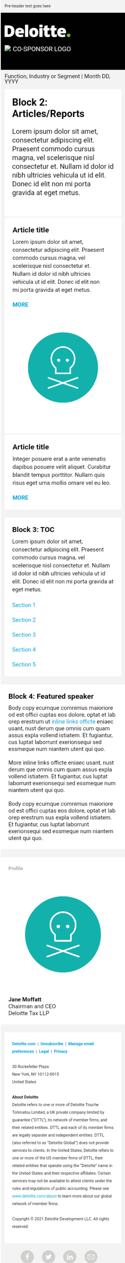 Contains a seperate section for Featured Speaker section. Two column layout for content and its links.